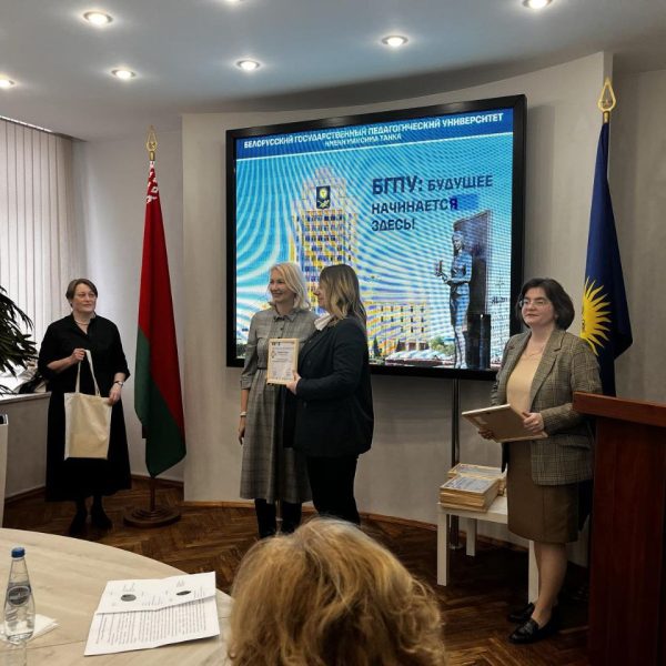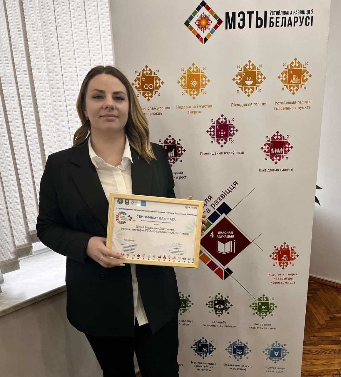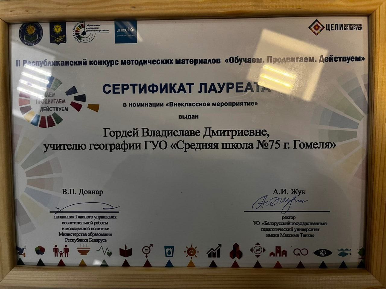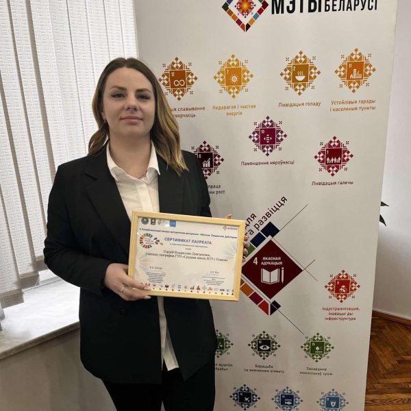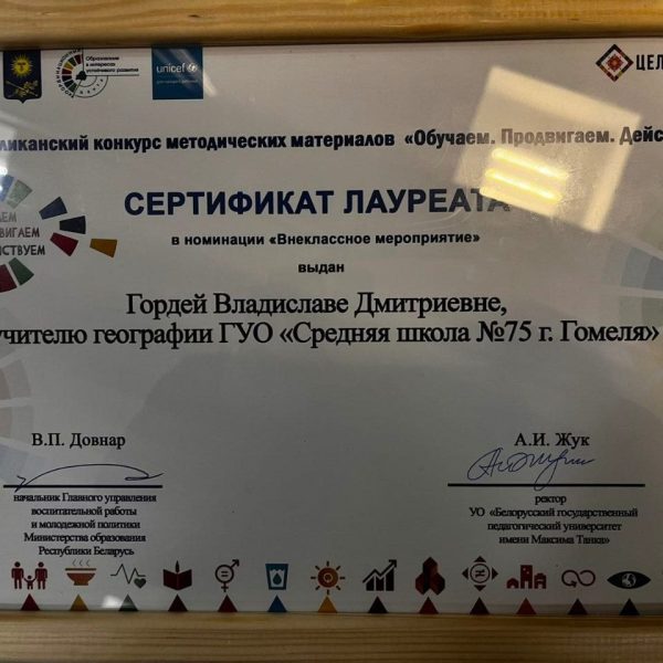 В рамках реализации миротворческого проекта учитель географии ГУО «Средняя школа №75 г.Гомеля» Гордей В. Д. завоевала высшую награду и стала лауреатом II Республиканского конкурса методических разработок «Обучаем. Продвигаем. Действуем. » в номинации «Внеклассное мероприятие», посвященного целям устойчивого развития Республики Беларусь.