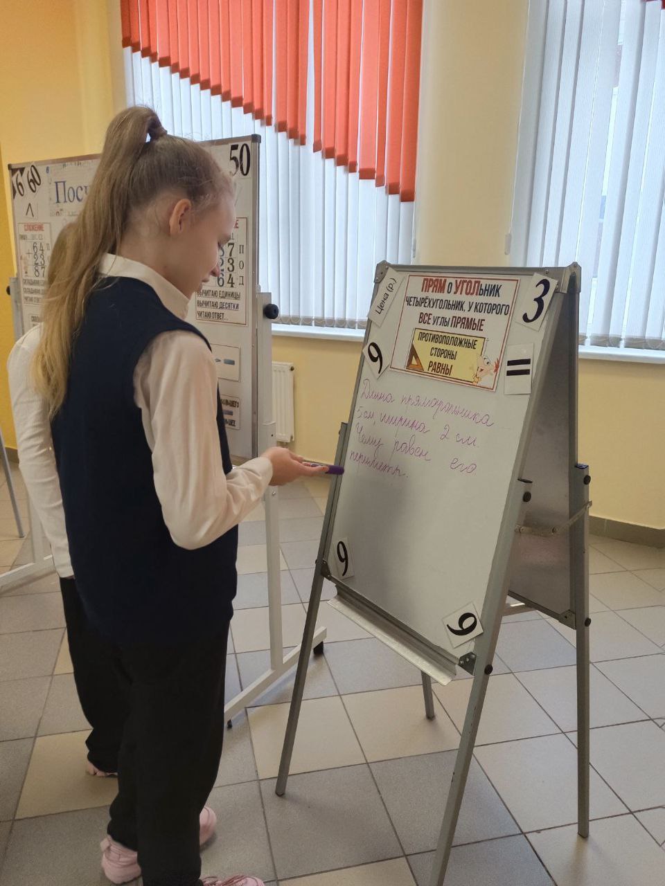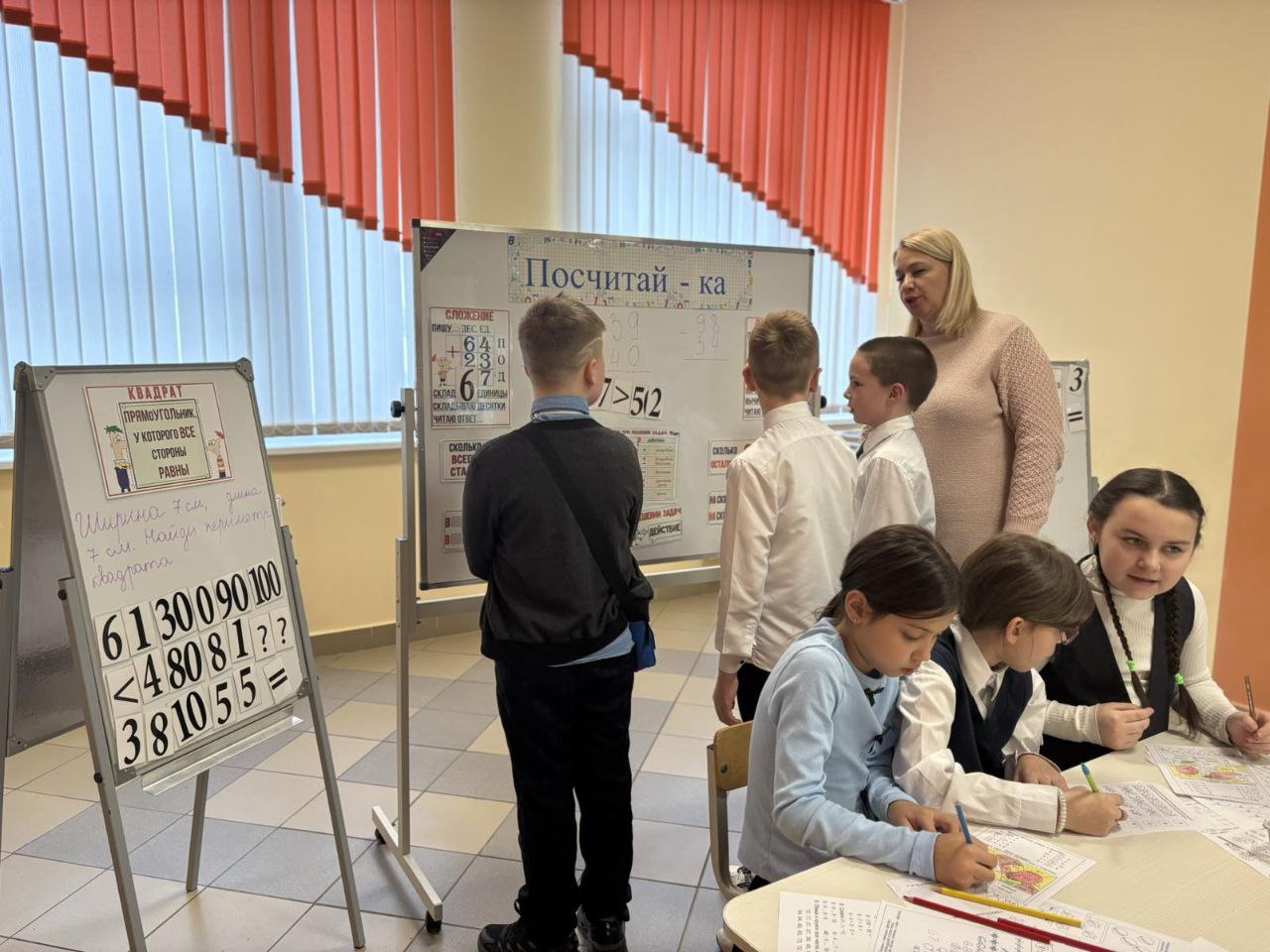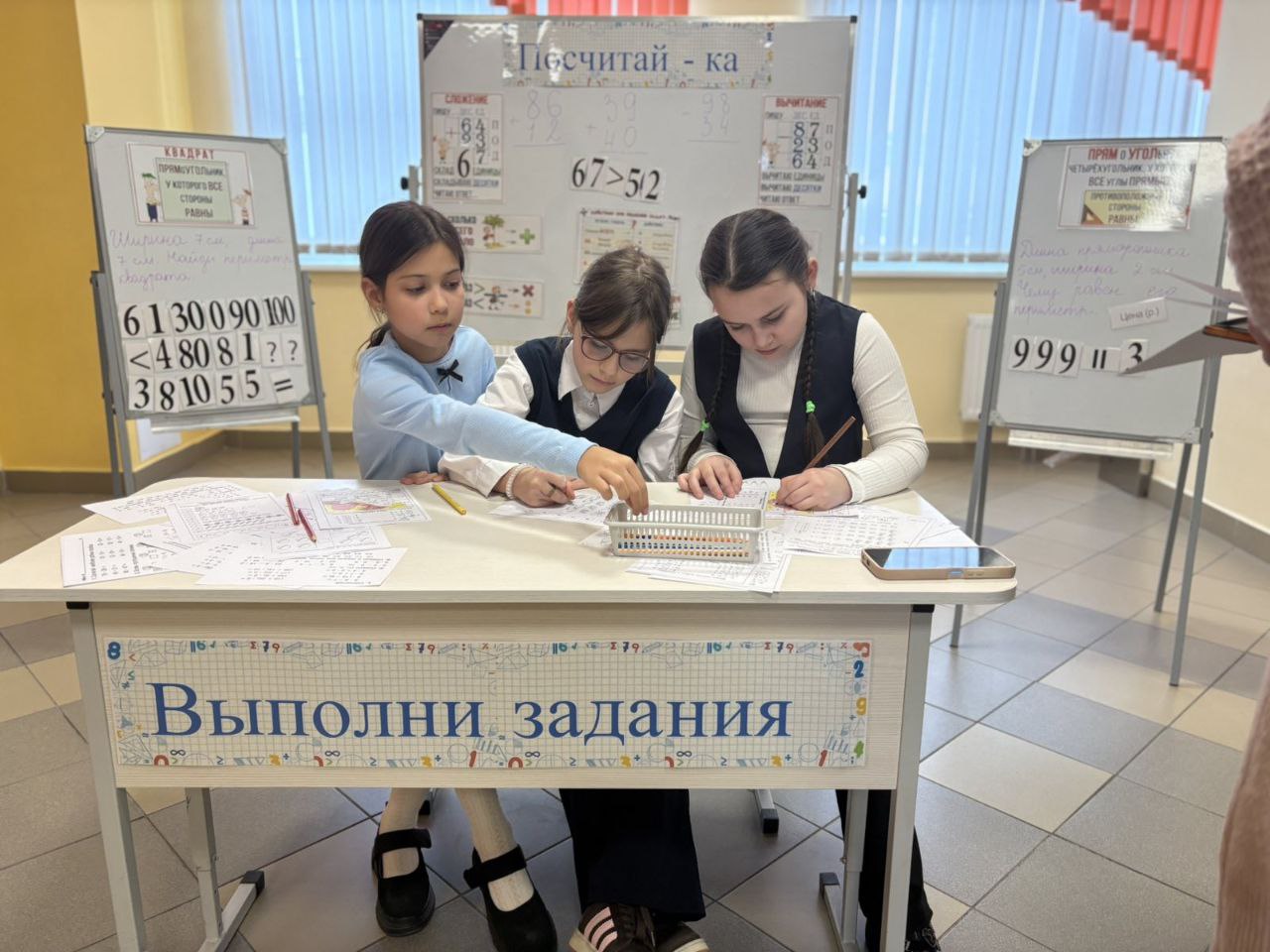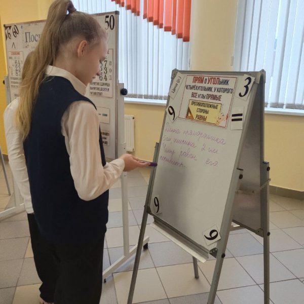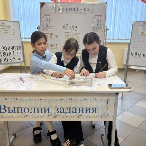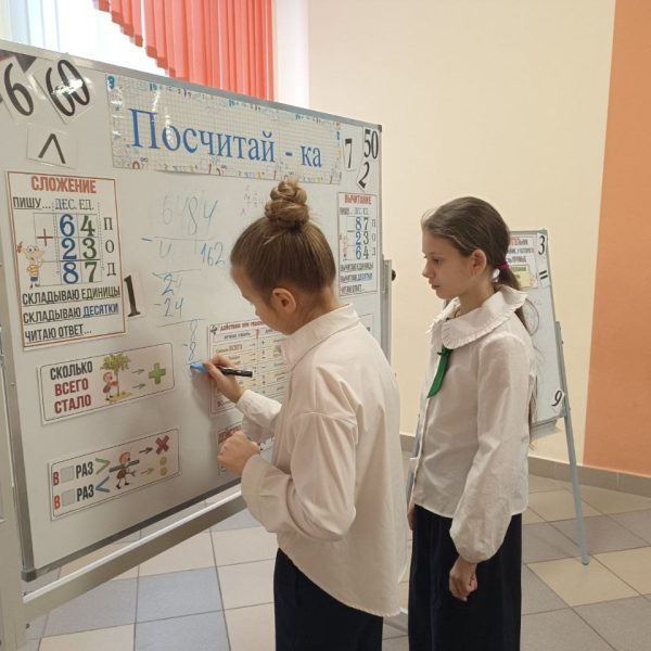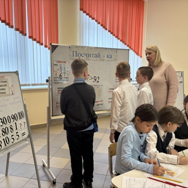 28.01 в ГУО «Средняя школа √75 г Гомеля» прошел День третий — «Псчитай-ка». Интерактивная зона «Посчитай-ка» — это игровое учебное пространство, где дети в наглядной и увлекательной форме осваивают основы математики: сложение двузначных чисел, сравнение чисел, геометрию и решение текстовых задач. Всё построено в формате воображаемой «Поездки», где каждый этап — это новое задание. Вот какие игры и задания здесь представлены: Сложение двузначных чисел (по разрядам) Пособие: Шаблон с разделами «ПИШУ…», «ДЕС.», «ЕД.». Сравнение чисел. Пособие: Яркие плакаты или карточки с заданиями на сравнение (например, 67 > 52). Решение текстовых задач («БАНКЕТНАЯ»). Пособие: Карточки с условиями задач (например, о стоимости предметов: ручка, тетрадь и т.д.). Как играть: Нужно найти общую сумму, выбирая правильный ответ из предложенных (34, 30, 64, 4 Знакомство с геометрией. Пособие: Задание «ПРЯМОУГОЛЬНИК» с определением («четырёхугольник, у которого все углы прямые») и изображениями фигур для идентификации. Как играть: Ребёнок ищет среди предложенных фигур (1, 2, 3, 4) прямоугольники, закрепляя зрительный образ и определение. Задачи на увеличение количества («СКОЛЬКО ВСЕГО СТАЛО?»). Пособие: Красочные схемы с вопросом и вариантами ответов, обозначенными как «РА3» (возможно, «раз» — количество раз или повторений). Как играть: Решается задача, где к изначальному количеству что-то добавляется несколько раз, и нужно найти итог. Зона вопросов и рефлексии. Пособие: Раздел «ВОПРОС?» или «РЕДАКТОР», где дети могут сами записать вопрос или скорректировать решение. Зона «Посчитай-ка» сочетает в себе развитие вычислительных навыков, логического мышления и пространственного воображения.