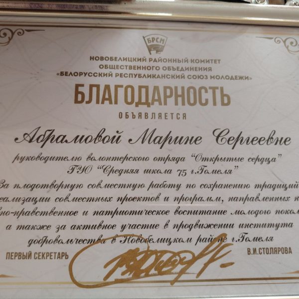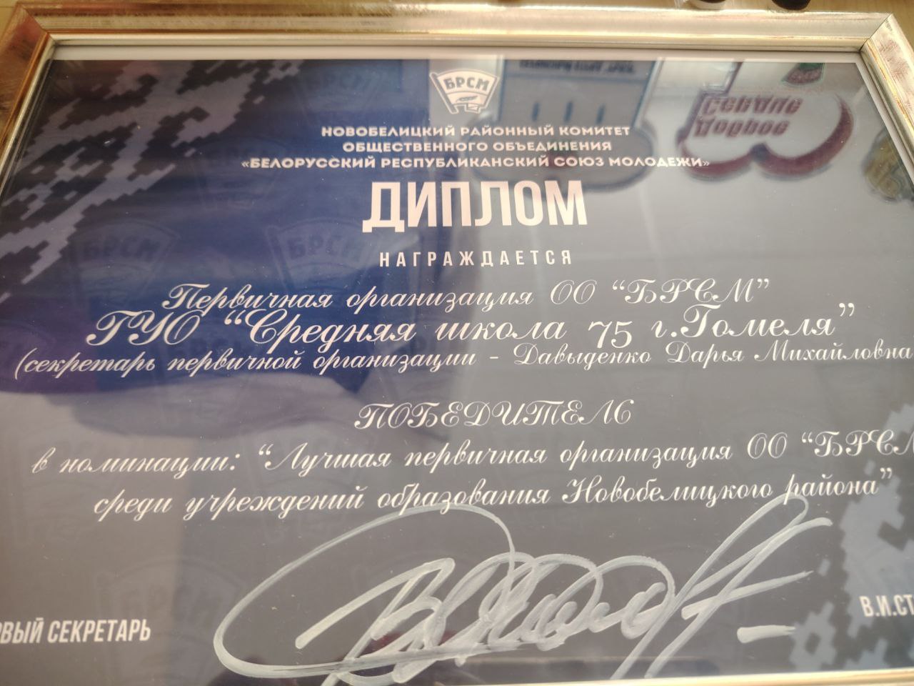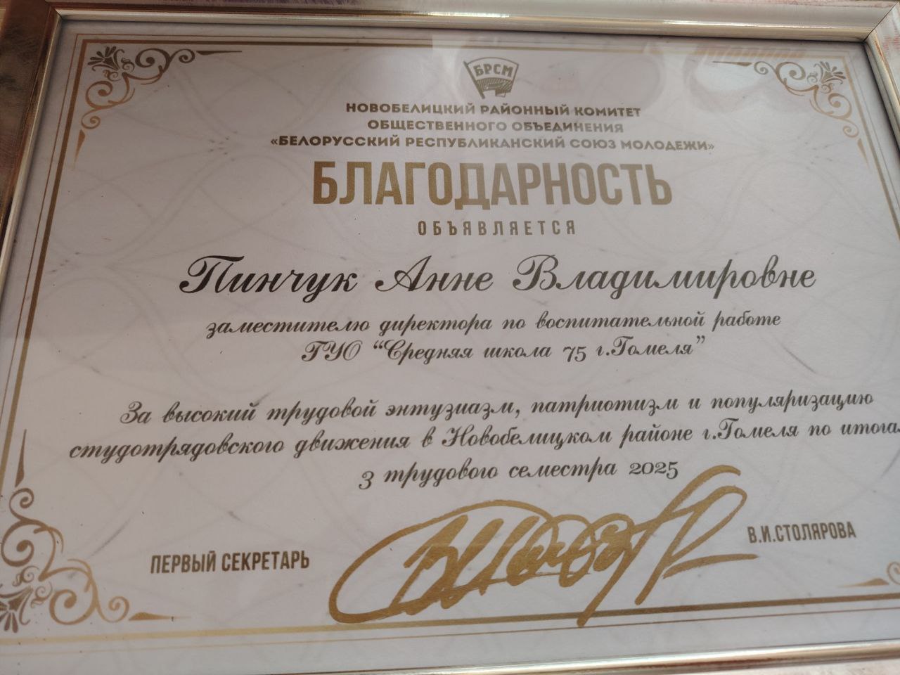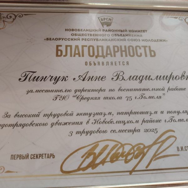 27 февраля 2026 года на базе УЗ «Гомельская университетская клиника-областной госпиталь инвалидов Великой Отечественной войны» прошел II Пленум Новобелицкой районной организации ОО «БРСМ». По итогам 2025 года мы подводим итоги и чествуем лучших! Лучшая первичная организация среди учреждений образования — ГУО «Средняя школа 75 г. Гомеля». Заместитель директора по воспитательной работе Пинчук А.В. была отмечена благодарностью за высокий трудовой энтузиазм, патриотизм и популяризацию студотрядовского движения по итогам 3 трудового семестра 2025. Руководитель по военно-патриотическому воспитанию Дорошевич Э.С. отмечен благодарностью за сохранение и приумножение традиций молодежного провоохранительного движения. Руководитель волонтёрского отряда «Открытые сердца » Абрамова М.С. отмечена благодарностью за активное участие в продвижении института добровольчества. Желаем учащимся дальнейших успехов и побед!!!