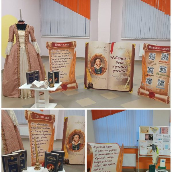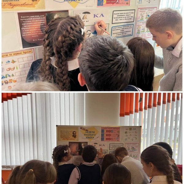 В холле первого этажа представлена интерактивная зона с онлайн-заданиями, на втором и третьем этажах- были размещены рисунки, коллажи по русскому языку, задания.Оформлена познавательная выставка «Галерея русских писателей» «Высказывания великих людей о русском языке».